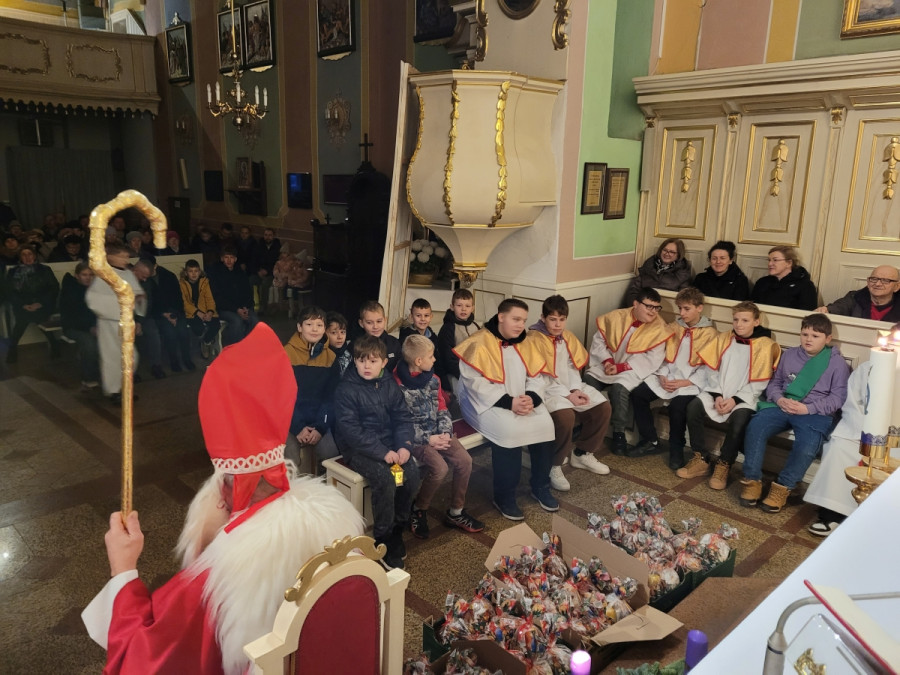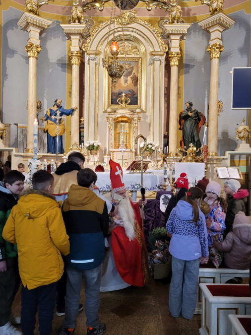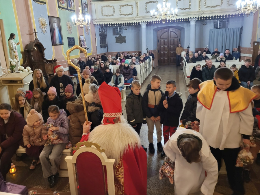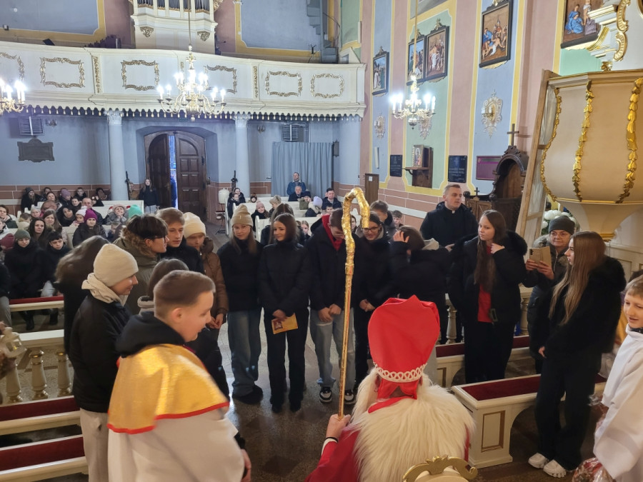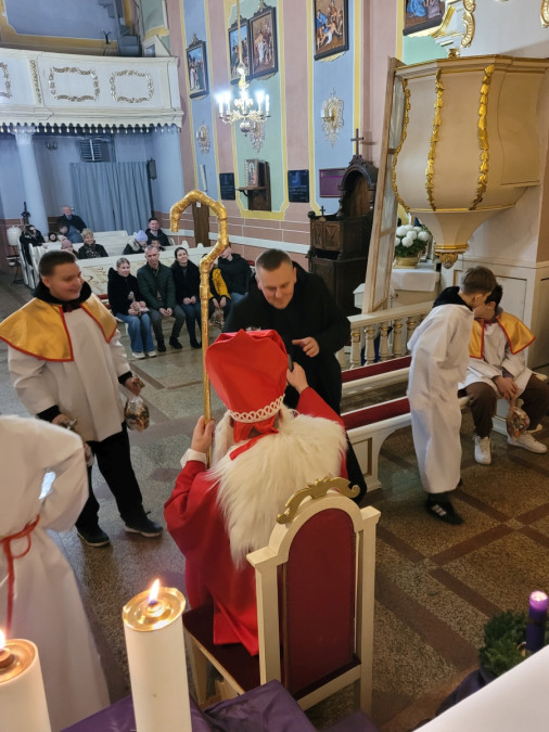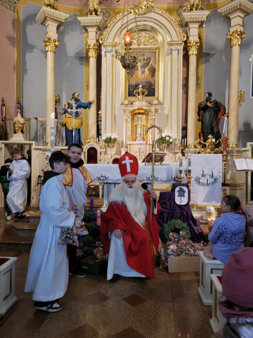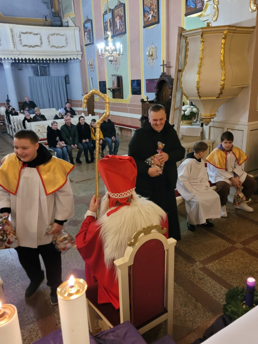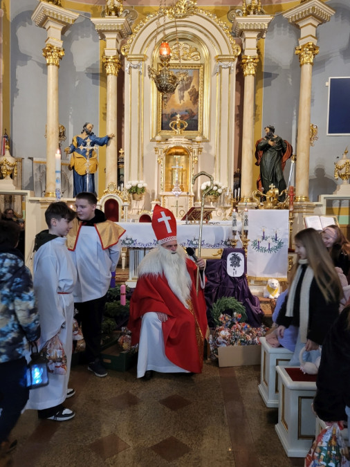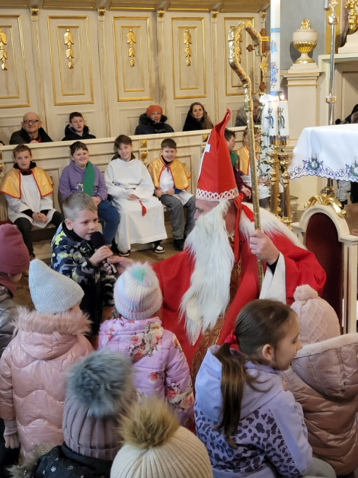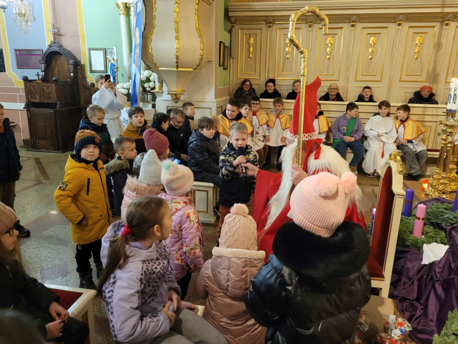 Spotkanie ze św. Mikołajem zawsze budzi emocje i nadzieje. W sobotę - 6 grudnia - przypadło liturgiczne wspomnienie tego świętego biskupa Myry (dzisiejsza Turcja), żyjącego w IV wieku. Niezwykły Gość zdążył przybyć do naszego kościoła na zakończenie Mszy św. Roratniej. 100. osobowa grupa dzieci i młodzieży wchodzącego św. Mikołaja przywitała niezwykle radośnie śpiewając mu 100 lat! Zmęczony ale uśmiechnięty biskup zasiadł na tronie przed głównym ołtarzem i rozpoczęło się radosne spotkanie. Kilkoro dzieci (te najbardziej odważne) zaśpiewało piosenki i wyrecytowało wiersze. Św. Mikołaj wyraził wdzięczność dzieciakom za ich obecność i trwanie przy Panu Jezusie wraz z Matką Bożą. Przekazał im słodkie paczki i obiecał, że w przyszłym roku też nie zapomni o naszej parafii. Do zobaczenia za rok