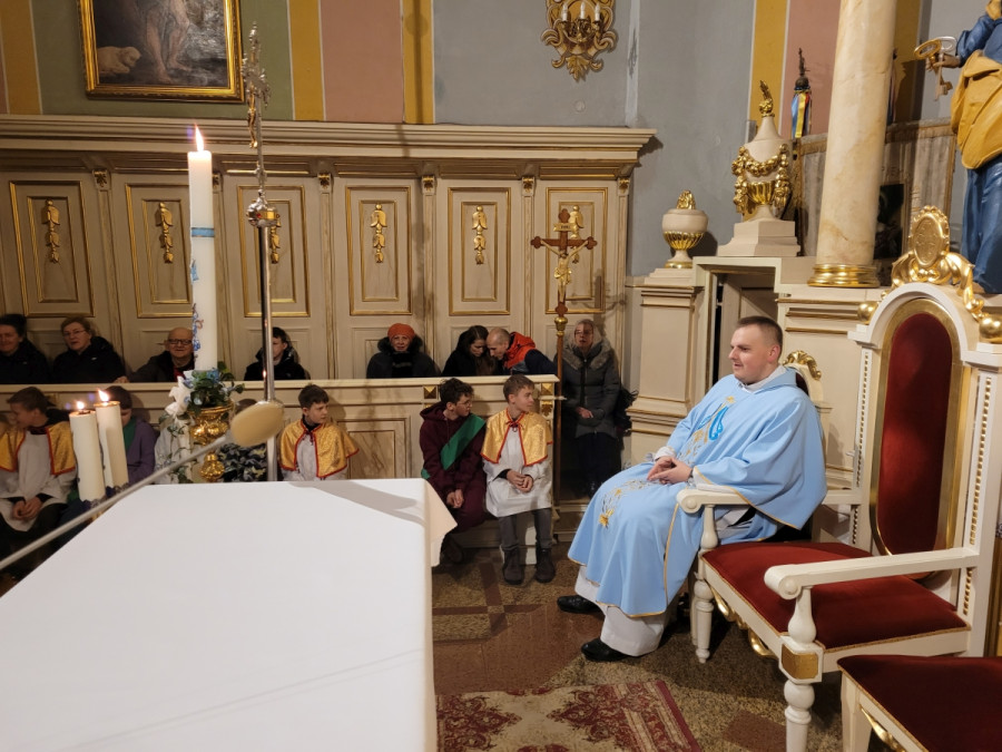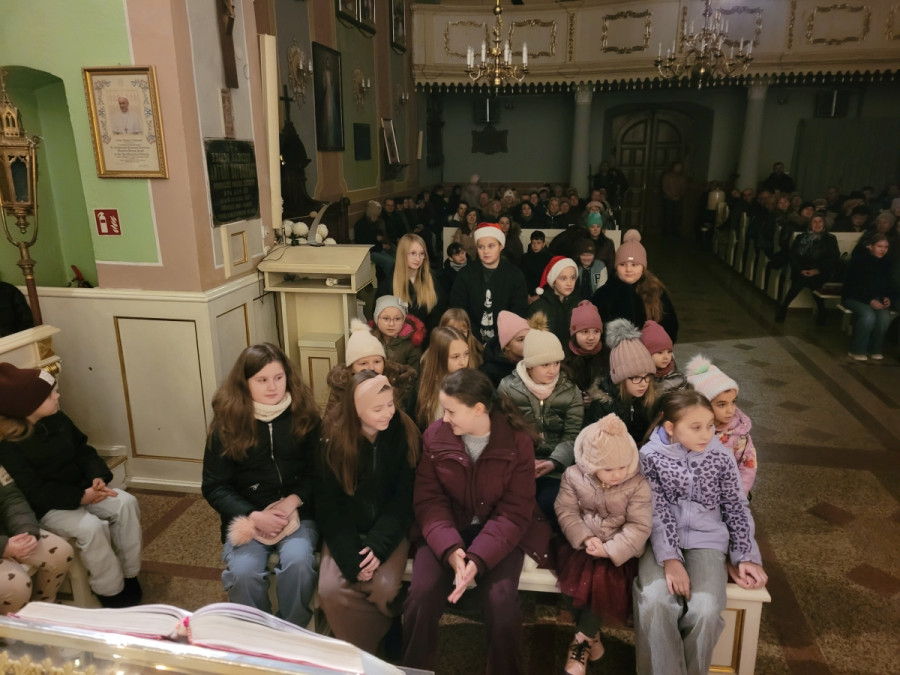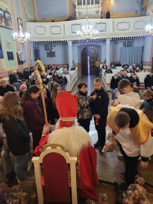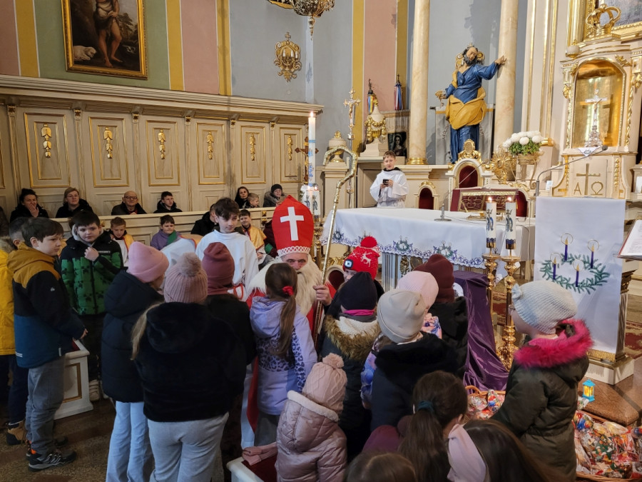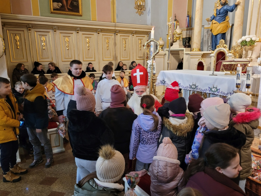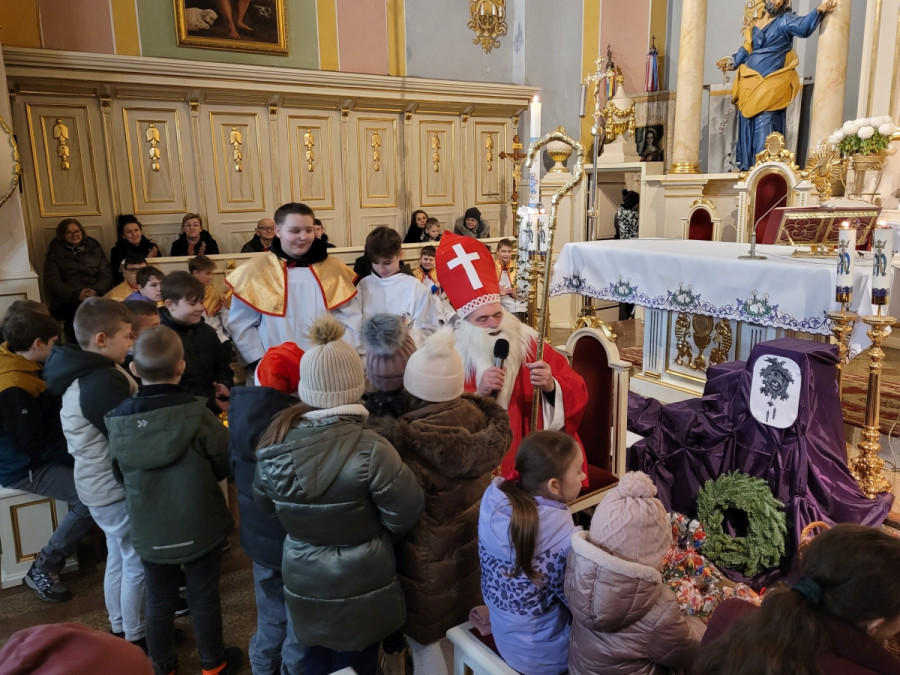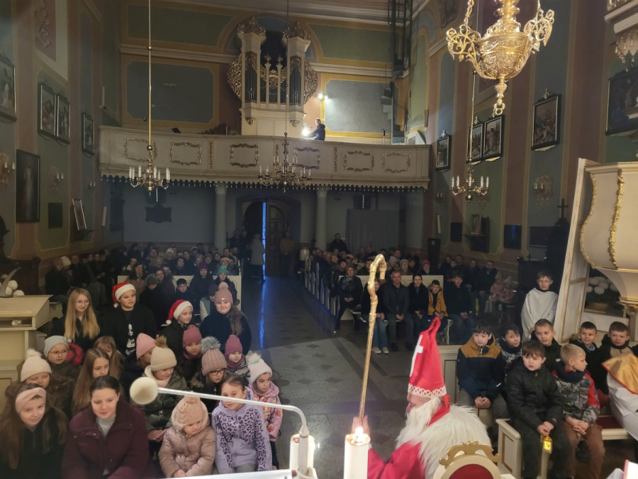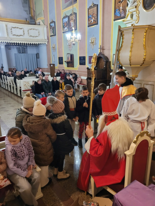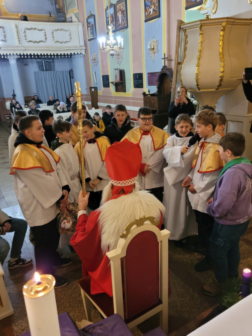 Spotkanie ze św. Mikołajem zawsze budzi emocje i nadzieje. W sobotę - 6 grudnia - przypadło liturgiczne wspomnienie tego świętego biskupa Myry (dzisiejsza Turcja), żyjącego w IV wieku. Niezwykły Gość zdążył przybyć do naszego kościoła na zakończenie Mszy św. Roratniej. 100. osobowa grupa dzieci i młodzieży wchodzącego św. Mikołaja przywitała niezwykle radośnie śpiewając mu 100 lat! Zmęczony ale uśmiechnięty biskup zasiadł na tronie przed głównym ołtarzem i rozpoczęło się radosne spotkanie. Kilkoro dzieci (te najbardziej odważne) zaśpiewało piosenki i wyrecytowało wiersze. Św. Mikołaj wyraził wdzięczność dzieciakom za ich obecność i trwanie przy Panu Jezusie wraz z Matką Bożą. Przekazał im słodkie paczki i obiecał, że w przyszłym roku też nie zapomni o naszej parafii. Do zobaczenia za rok
