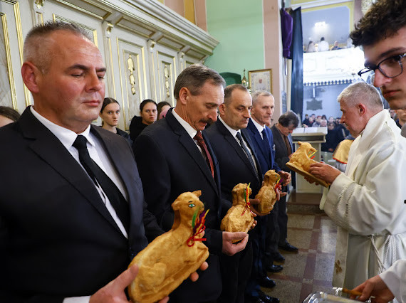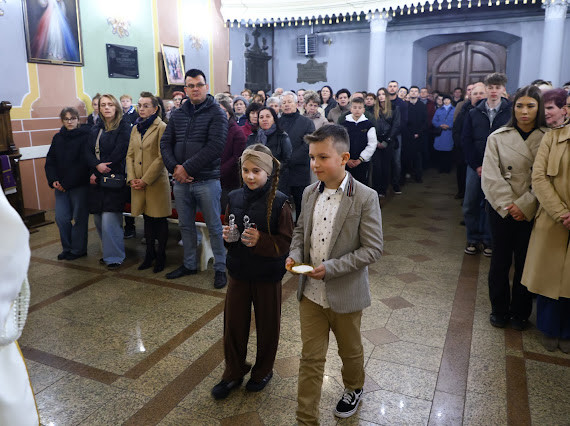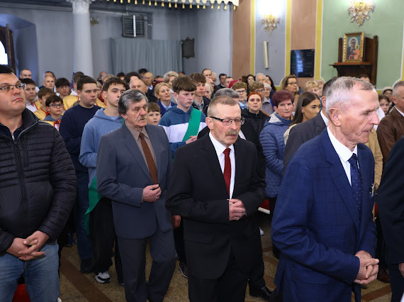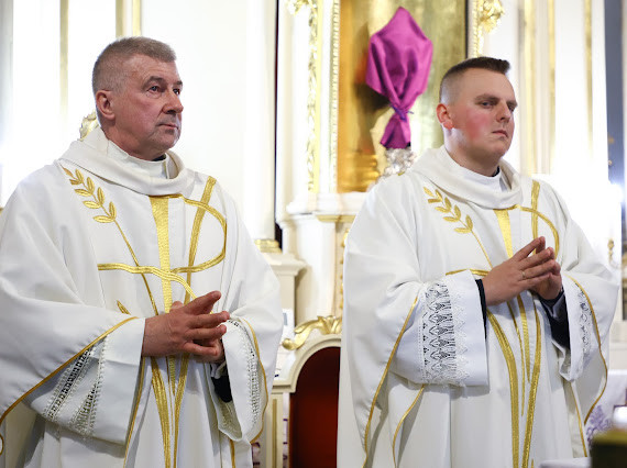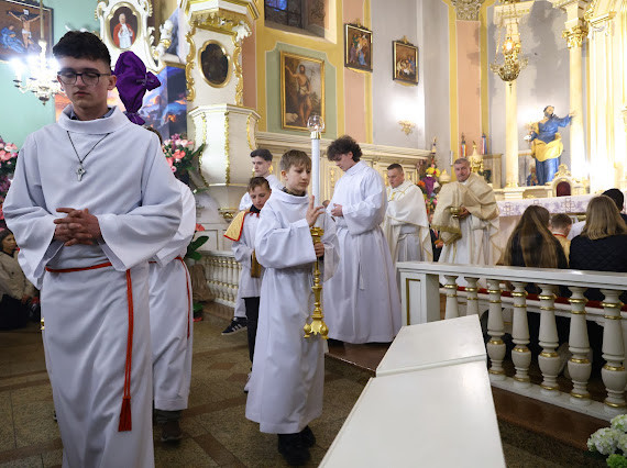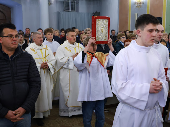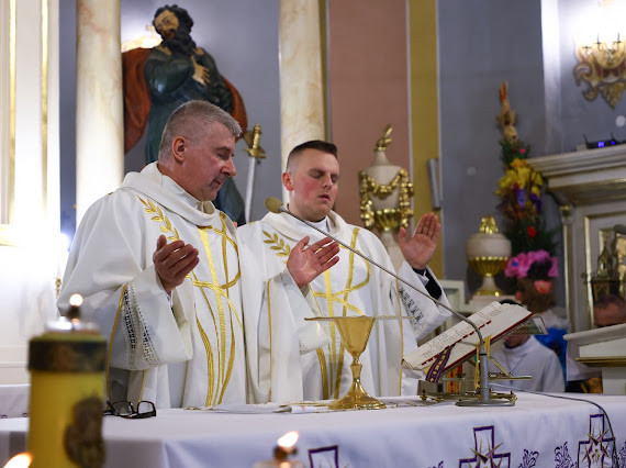 Wielki Czwartek rozpoczyna Triduum Paschalne, najważniejsze wydarzenia roku liturgicznego. To dzień wdzięczności Chrystusowi za dwa sakramenty - Eucharystię i kapłaństwo. Mszy Wieczerzy Pańskiej o godz. 18.00, przewodniczył proboszcz ks. Ireneusz Kosecki, którą sprawował z wikariuszem, ks. Piotrem Auguścikiem. Na początku Eucharystii, przedstawiciele parafii - rodzice dzieci, które w tym roku po raz pierwszy przyjmą Komunię św. złożyli naszym księżom życzenia, z okazji ich święta. Wyrazili im wdzięczność za gorliwą pracę duszpasterską, życząc dużo bożej mocy i radości w prowadzeniu ludzi do Chrystusa. W homilii ks. proboszcz przypomniał jest wielkim darem jest Eucharystia – chleb na życie wieczne - która jest dla nas, grzeszników, lekarstwem w drodze do nieba. Wielki Czwartek to także dziękczynienie za sakrament kapłaństwa. Kaznodzieja zachęcał młodzież, aby zaufała Chrystusowi i podjęła ryzyko przyjęcia daru powołania do kapłaństwa. Po homilii, miał miejsce obrzęd obmycia nóg 12 mężczyznom, przypominający gest miłości Chrystusa z Wieczernika, który umył nogi 12 Apostołom. Po zakończonej Mszy św. nastąpiło przeniesienie Najświętszego Sakramentu do ołtarza adoracji, zwanego „Ciemnicą”, którą w tym roku wykonali członkowie Akcji Katolickiej. Do godz. 22.00 trwała adoracja Jezusa Eucharystycznego.