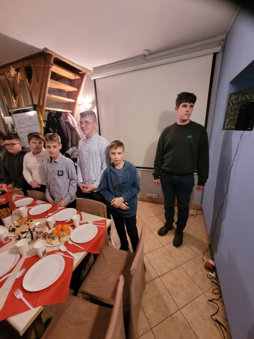 W sobotę, 21 grudnia br., o godz. 19.00 rozpoczęło się spotkanie wigilijne dziecięcych i młodzieżowych grup formacyjnych: scholi, oazy dziecięce, młodzieżowej oraz ministrantów. W pięknie przygotowanej świetlicy „Barka” młodzież wraz z kapłanami odśpiewali kolędę, odczytali fragment z Pisma Świętego mówiący o Narodzeniu Pańskim i przełamali się opłatkiem, składając sobie życzenia. Ten piękny wieczór spędzili miło czas na prawdziwej wieczerzy wigilijnej. Na stołach znalazły się między innymi barszczyk z uszkami, pierogi, pierniczki oraz herbata zimowa