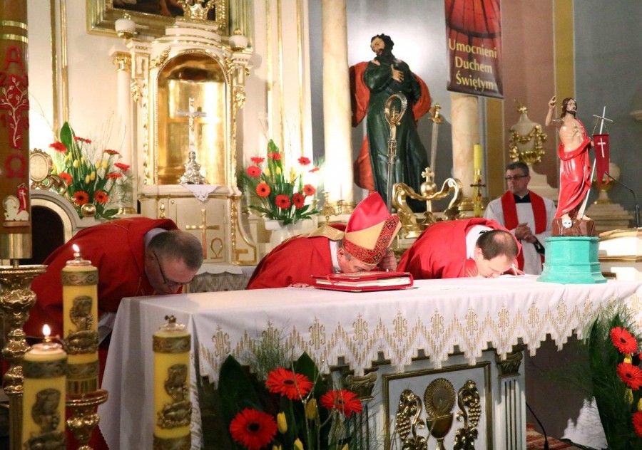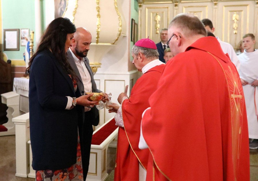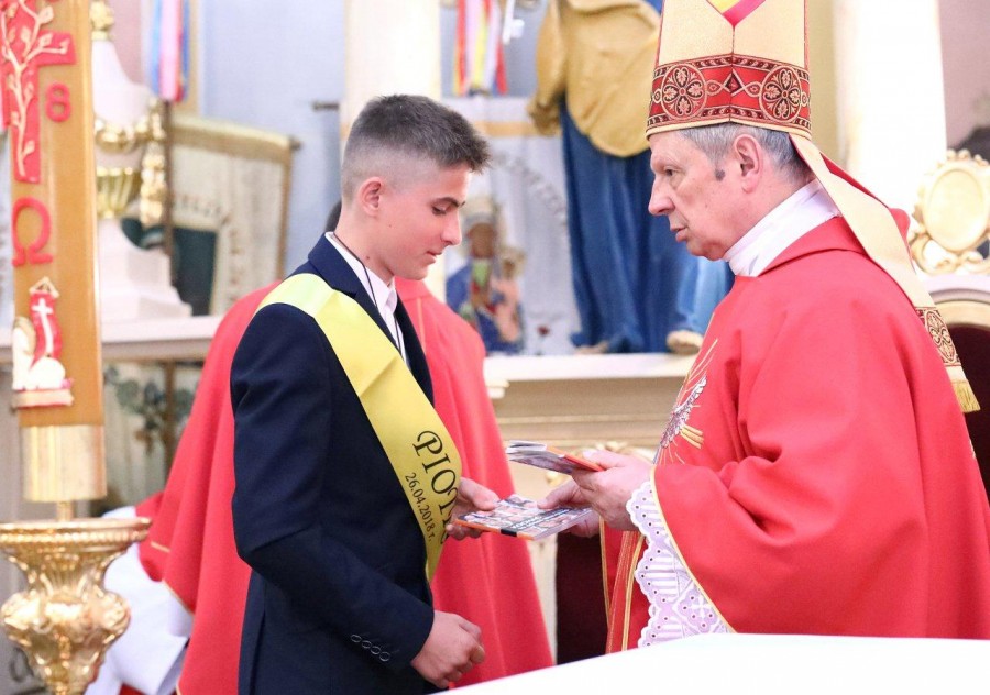 26 kwietnia br. młodzież trzecich klas gimnazjalnych, przyjęła sakrament bierzmowania. Mszy św. o godz. 17.00 przewodniczył i darów Ducha św. udzielił, Pasterz naszej diecezji ks. biskup Henryk Tomasik. W homilii zachęcał, by w Roku Ducha św. zaprzyjaźnić się z Nim, i powierzać Mu swoje młodzieńcze plany i marzenia. Na wzór św. Piotra, każdy z nas jest zobowiązany do udzielenia odpowiedzi Chrystusowi - czy Mnie miłujesz? - mówił w homilii nasz Pasterz. Na zakończenie Eucharystii młodzież podziękowała ks. biskupowi za dary Ducha św., a ks. proboszcz Ireneusz Kosecki, zapewnił Pasterza, że młodzież, mając przykład i świadectwo swoich rodziców, pragnie trwać przy Chrystusie i swoim życiem odpowiadać Mu - Panie, Ty wszystko wiesz, Ty wiesz, że Cię kocham. Ks. proboszcz wyraził słowa wdzięczności tym wszystkim, którzy przygotowali tę uroczystość - ks. Kamilowi Kowalskiemu i katechetce, p. Beacie Piasek oraz paniom katechetkom, które uczyły młodzież w szkole podstawowej - p. Bożenie Chłopeckiej i Monice Wierzbie. Pamiątkowe zdjęcie młodzieży z księdzem biskupem, kapłanami, katechetkami, Dyrekcją naszego Gimnazjum i wychowawcami, będzie radosnym wspomnieniem tej pięknej Uroczystości.