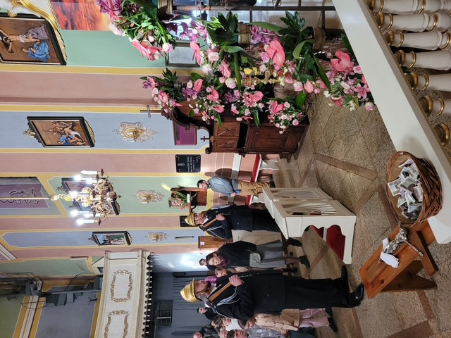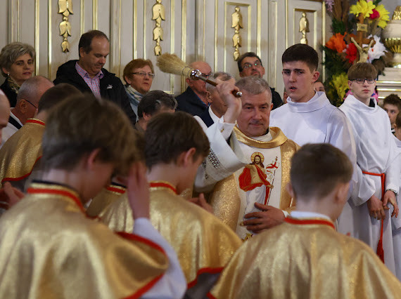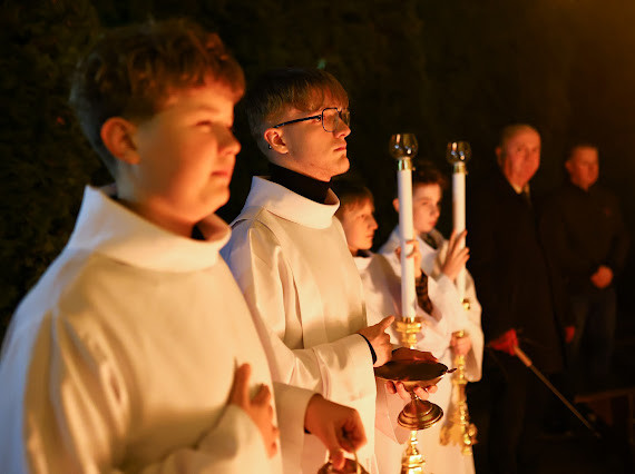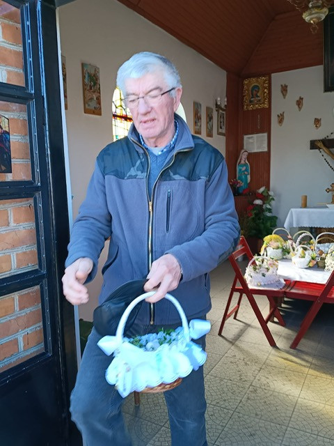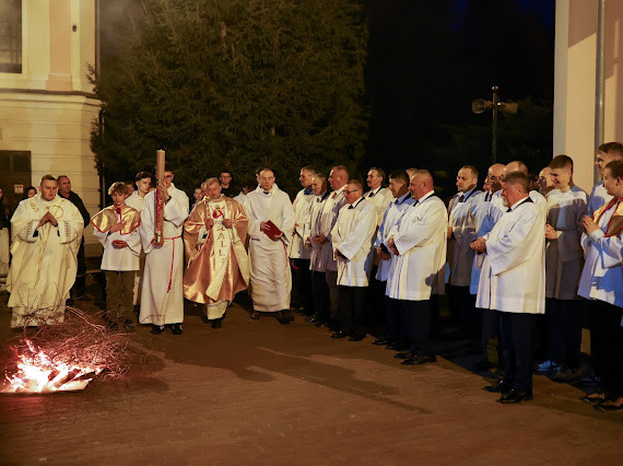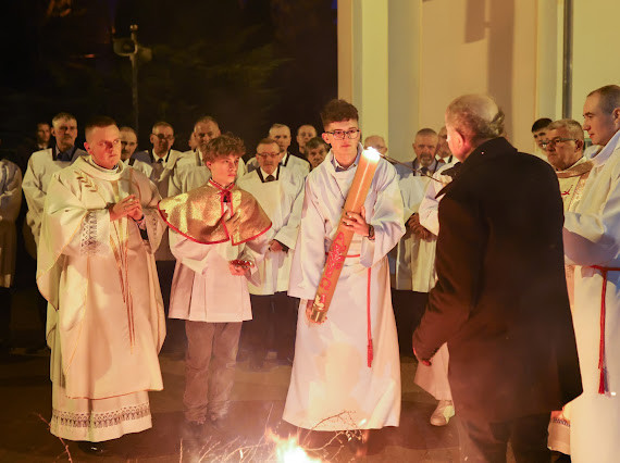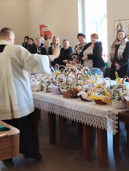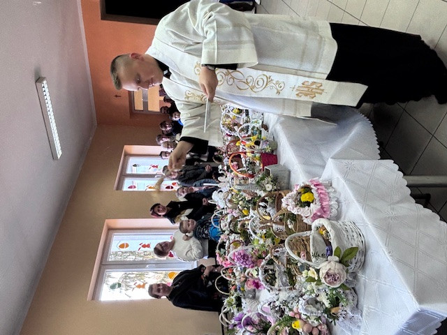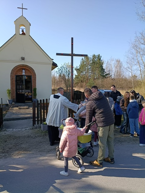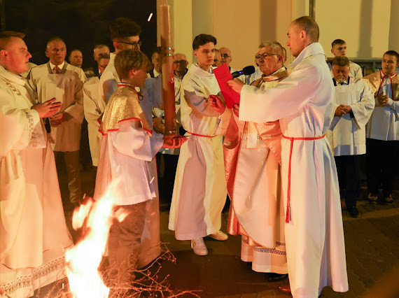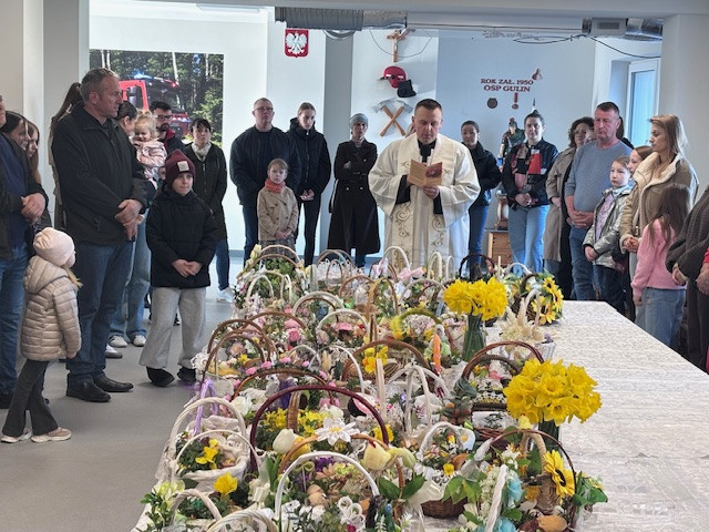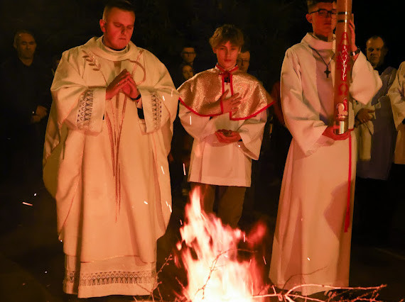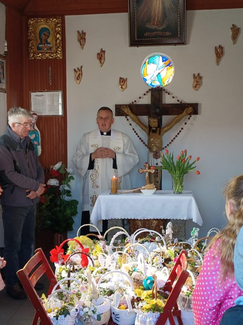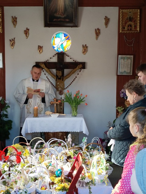 Wielka Sobota - jest dniem niezwykle bogatym w przeżycia religijne i piękną liturgię. W godzinach przedpołudniowych w kościele i po wioskach zostały poświęcone pokarmy wielkanocne. Przez cały dzień trwała adoracja Jezusa Eucharystycznego w „Grobie”. Adorowali strażacy z poszczególnych jednostek OSP naszej parafii, Ułani z Kawalerii Ochotniczej w barwach 11 pułku Ułanów Legionowych przy stadninie Carino w Gulinie oraz grupy parafialne. O godz. 20.00 rozpoczęła się Wigilia Paschalna, której przewodniczył proboszcz ks. Ireneusz Kosecki. Składa się ona z kilku części: obrzędu światła, Liturgii Słowa, Liturgii Chrzcielnej i Liturgii Eucharystycznej. Orędzie Wielkanocne - w wykonaniu organisty Jarosława Szczepaniaka, przypominało nam o przejściu z nocy grzechu do blasku bożej łaski. W homilii, którą wygłosił ks. proboszcz, wybrzmiała zachęta, by z Chrystusem Zmartwychwstałym podnosić się z grzechów i żyć w bliskości Boga, dokonywać nieustannej „Paschy” – przejścia od niewoli grzechu ku wolności serca, by nie ulegać zwątpieniu, ale ufać Chrystusowi - mówił kaznodzieja.