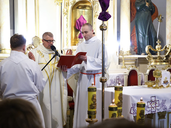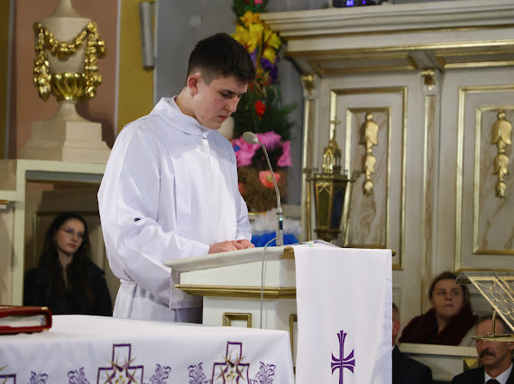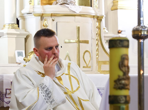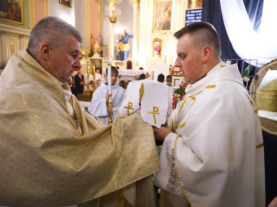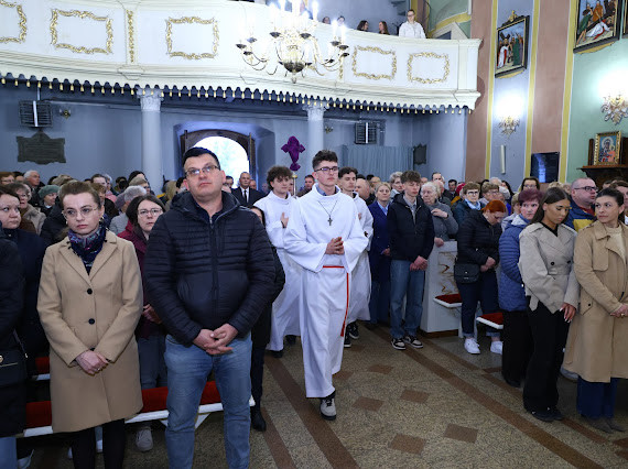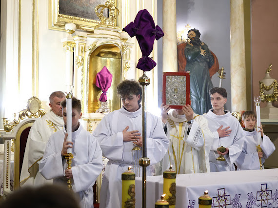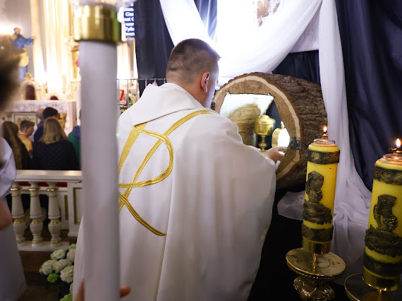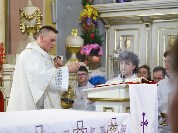 Wielki Czwartek rozpoczyna Triduum Paschalne, najważniejsze wydarzenia roku liturgicznego. To dzień wdzięczności Chrystusowi za dwa sakramenty - Eucharystię i kapłaństwo. Mszy Wieczerzy Pańskiej o godz. 18.00, przewodniczył proboszcz ks. Ireneusz Kosecki, którą sprawował z wikariuszem, ks. Piotrem Auguścikiem. Na początku Eucharystii, przedstawiciele parafii - rodzice dzieci, które w tym roku po raz pierwszy przyjmą Komunię św. złożyli naszym księżom życzenia, z okazji ich święta. Wyrazili im wdzięczność za gorliwą pracę duszpasterską, życząc dużo bożej mocy i radości w prowadzeniu ludzi do Chrystusa. W homilii ks. proboszcz przypomniał jest wielkim darem jest Eucharystia – chleb na życie wieczne - która jest dla nas, grzeszników, lekarstwem w drodze do nieba. Wielki Czwartek to także dziękczynienie za sakrament kapłaństwa. Kaznodzieja zachęcał młodzież, aby zaufała Chrystusowi i podjęła ryzyko przyjęcia daru powołania do kapłaństwa. Po homilii, miał miejsce obrzęd obmycia nóg 12 mężczyznom, przypominający gest miłości Chrystusa z Wieczernika, który umył nogi 12 Apostołom. Po zakończonej Mszy św. nastąpiło przeniesienie Najświętszego Sakramentu do ołtarza adoracji, zwanego „Ciemnicą”, którą w tym roku wykonali członkowie Akcji Katolickiej. Do godz. 22.00 trwała adoracja Jezusa Eucharystycznego.